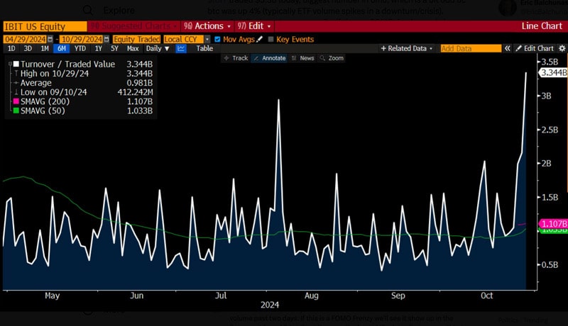 در تاریخ ۲۹ اکتبر، حجم معاملات روزانه صندوق قابل معامله در بورس (ETF) اسپات بیتکوین بلکراک (IBIT) به ۳.۳۵ میلیارد دلار رسید که بالاترین سطح در بیش از ۶ ماه گذشته محسوب میشود.