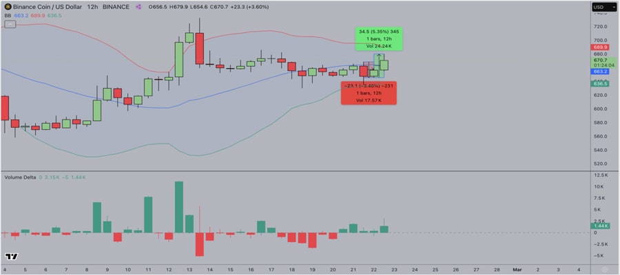 همچنین، شاخصهای حجم دلتا (Delta) و حجم تعادلی (OBV) نشاندهنده فشار خرید قوی هستند. با این حال، اگر BNB نتواند از سطح ۶۸۹.۸ دلار عبور کند، ممکن است تا ۶۳۶.۵ دلار اصلاح شود.