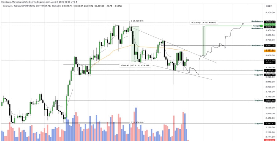 تحلیل تکنیکال نیز نشان میدهد که یک الگوی «کنج نزولی» در نمودار چهار ساعته اتریوم در حال شکلگیری است. این الگو معمولاً بهعنوان سیگنالی صعودی تلقی میشود. در صورت تکمیل این الگو، قیمت اتریوم میتواند تا ۱۷ درصد افزایش یابد و به ۴,۰۰۰ دلار برسد.