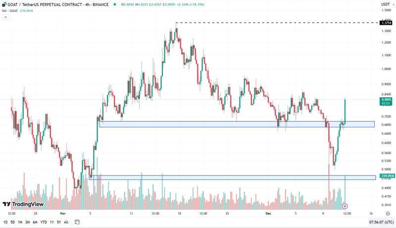 در حال حاضر، قیمت GOAT در محدوده ۰.۸۰۹۵ دلار قرار دارد و توانسته از سطح مقاومت ۰.۷۰ دلار که یک نقطه کلیدی است، عبور کند.