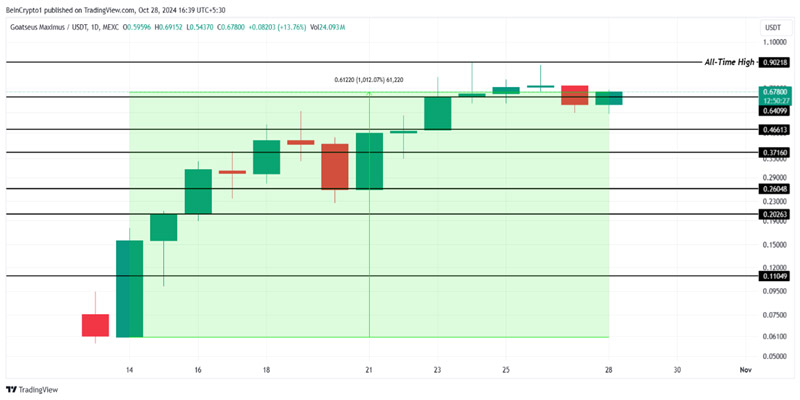 یکی از میمکوینهای برجسته در ماه اخیر، گوتسیوس ماکسیموس بوده است. این ارز دیجیتال توانسته در کمتر از یک ماه با رشدی حدودا ۱۰۱۲ درصد به رکورد قیمتی جدیدی در ۰.۹۰۲ دلار دست یابد.